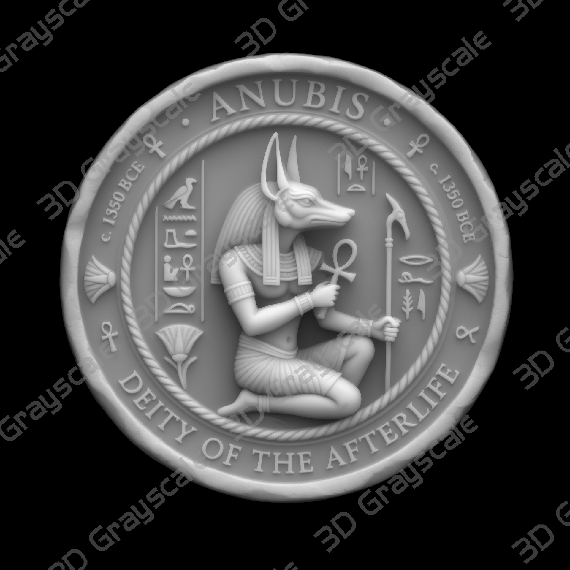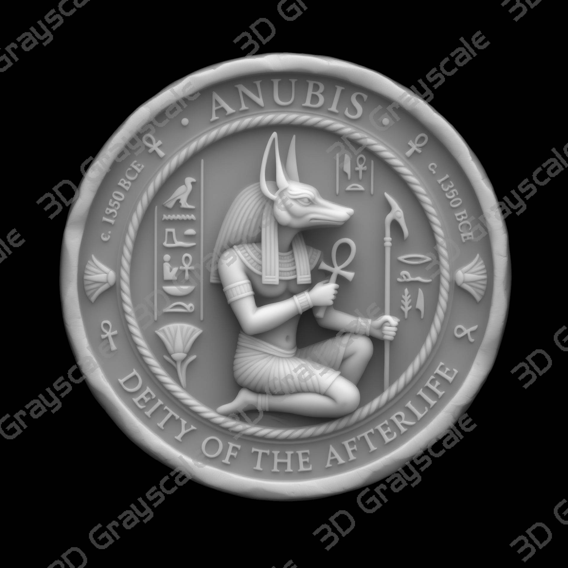 Highly detailed Anubis Jackal God Egyptian Underworld coin depth map designed for 3D laser engraving, embossing, and relief engraving on coins.