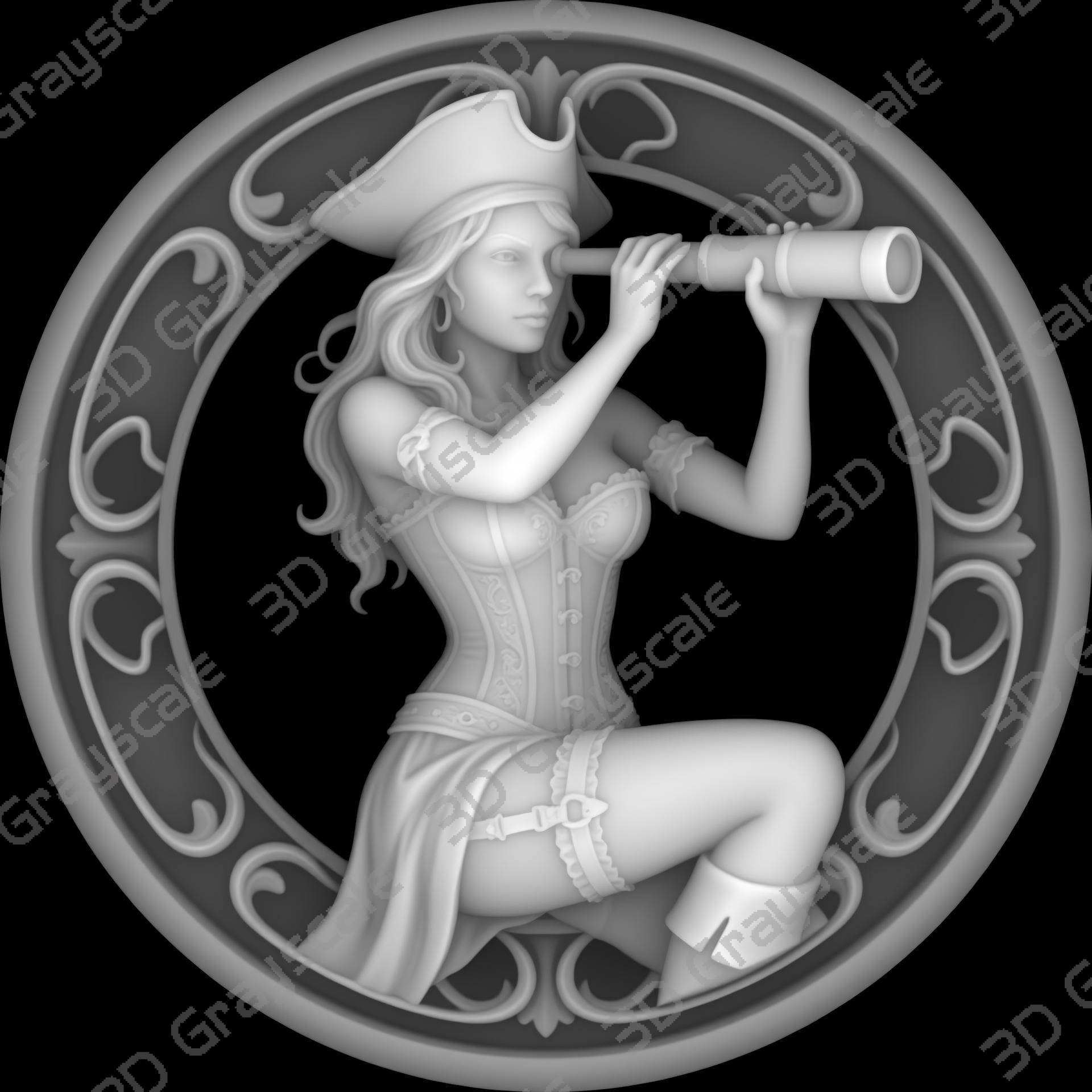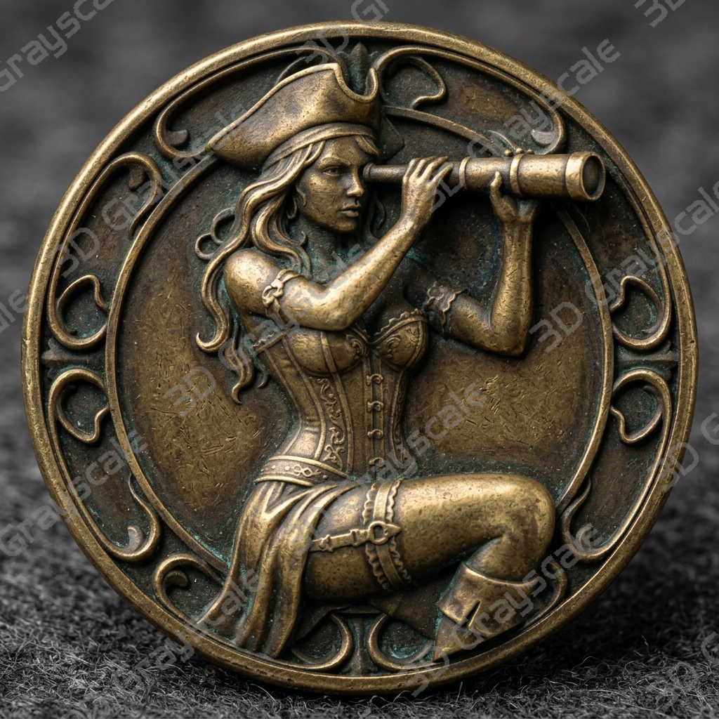 Create highly detailed 3D engraved coins with this Spyglass seductress Sexy Female Pirates depth map, built for clean and consistent laser engraving results.