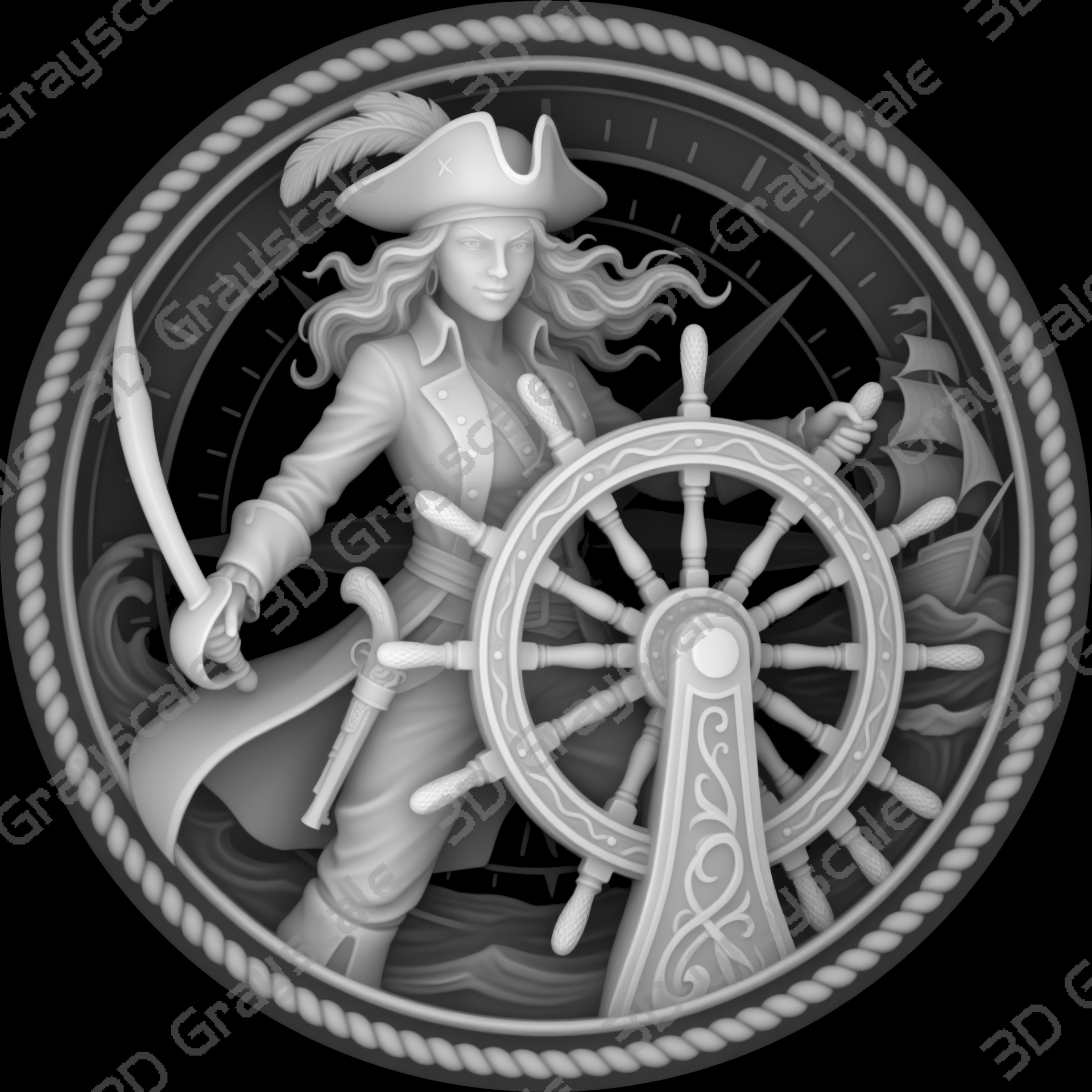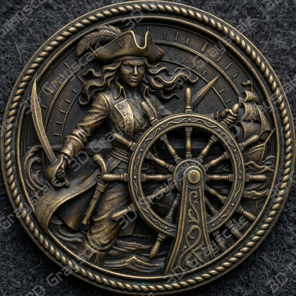 Create highly detailed 3D engraved coins with this Ship’s wheel enchantress Sexy Female Pirates depth map, built for clean and consistent laser engraving results.