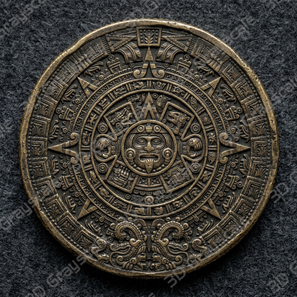 Highly detailed Aztec Sun Stone Aztec Sun Stones coin depth map designed for 3D laser engraving, embossing, and relief engraving on coins.