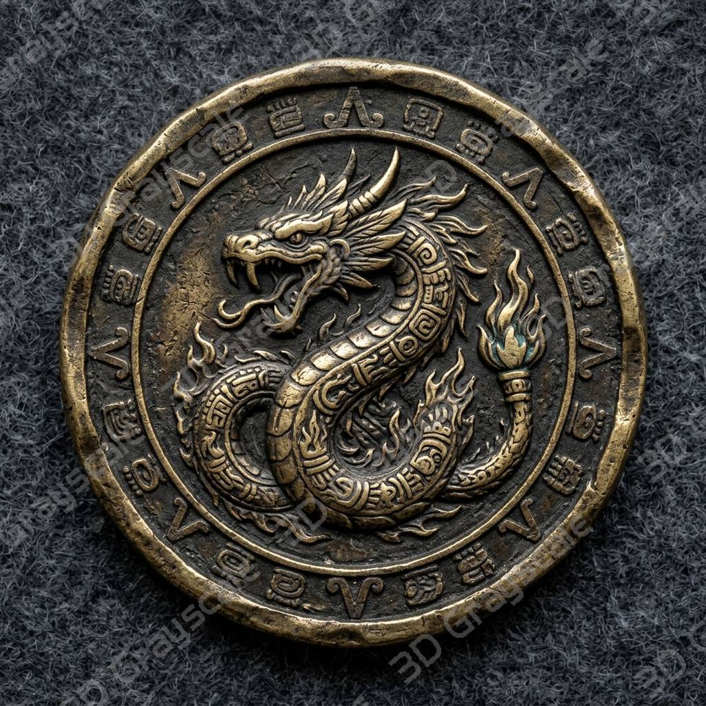 Xiuhcoatl Fire Serpent Aztec Sun Stones Coin Depth Map for Laser Engraving
