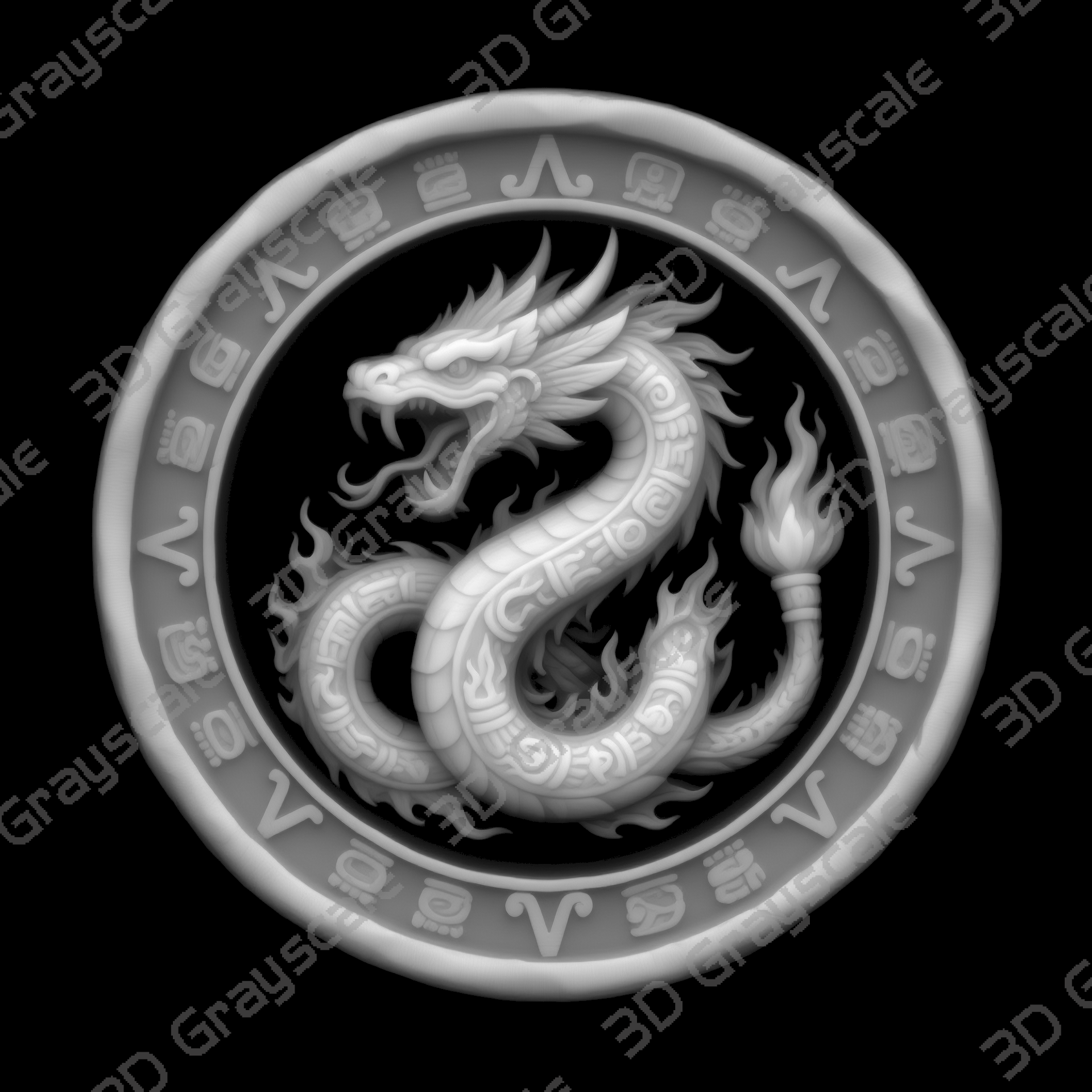 Highly detailed Xiuhcoatl Fire Serpent Aztec Sun Stones coin depth map designed for 3D laser engraving, embossing, and relief engraving on coins.