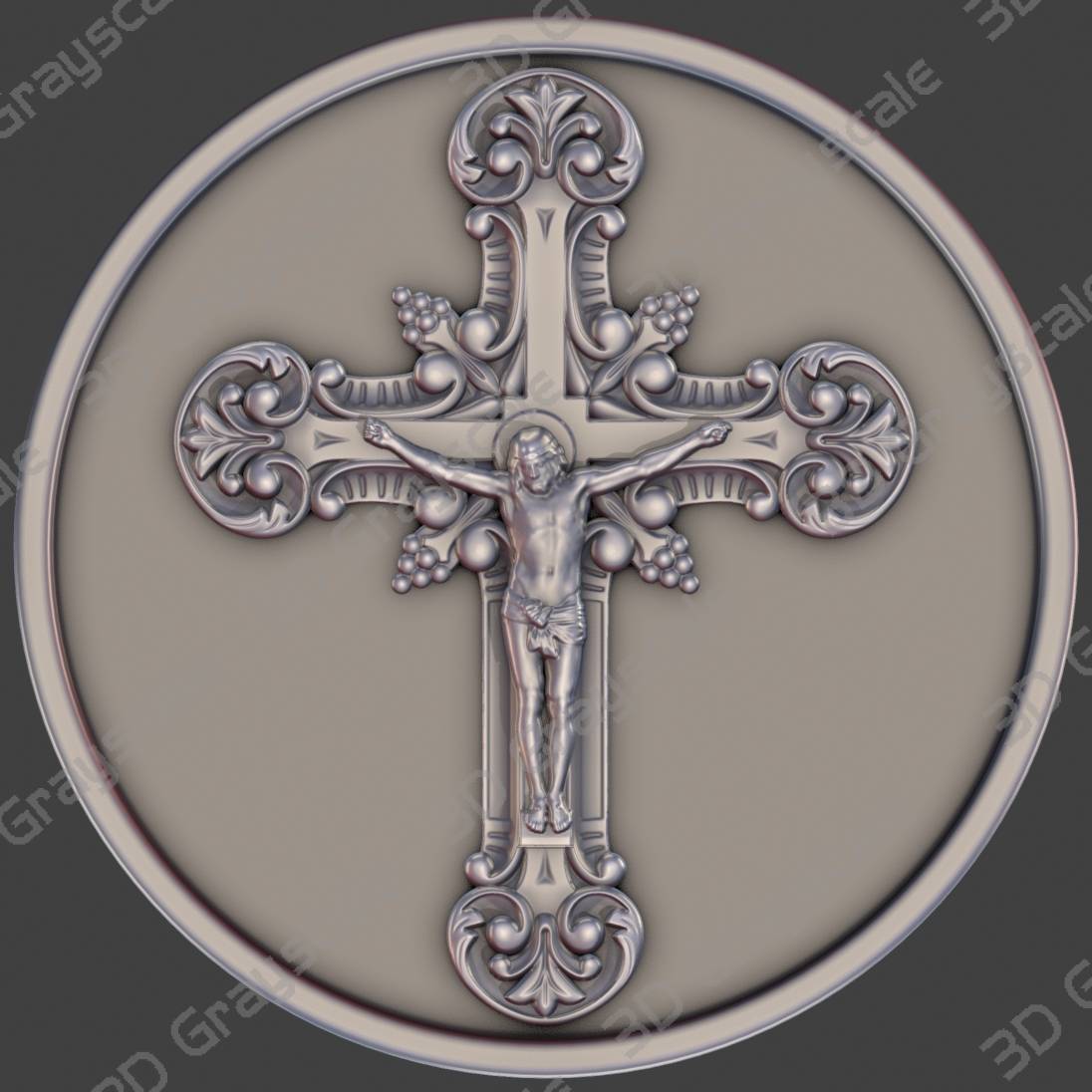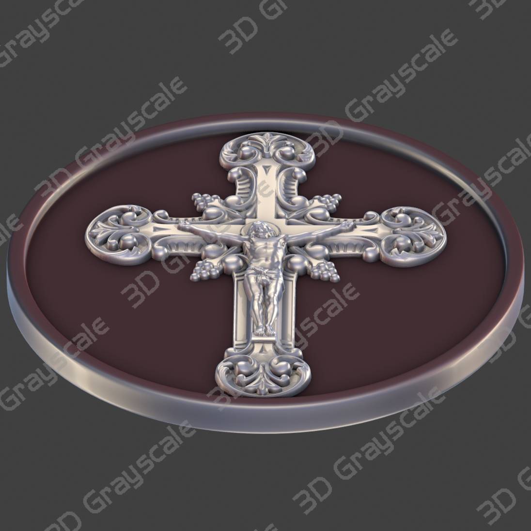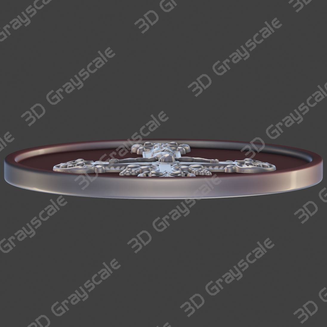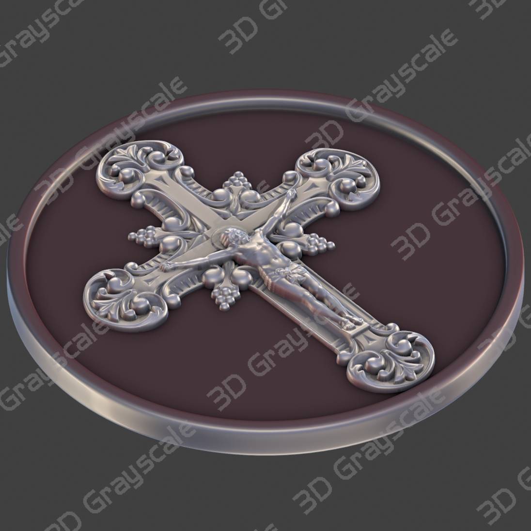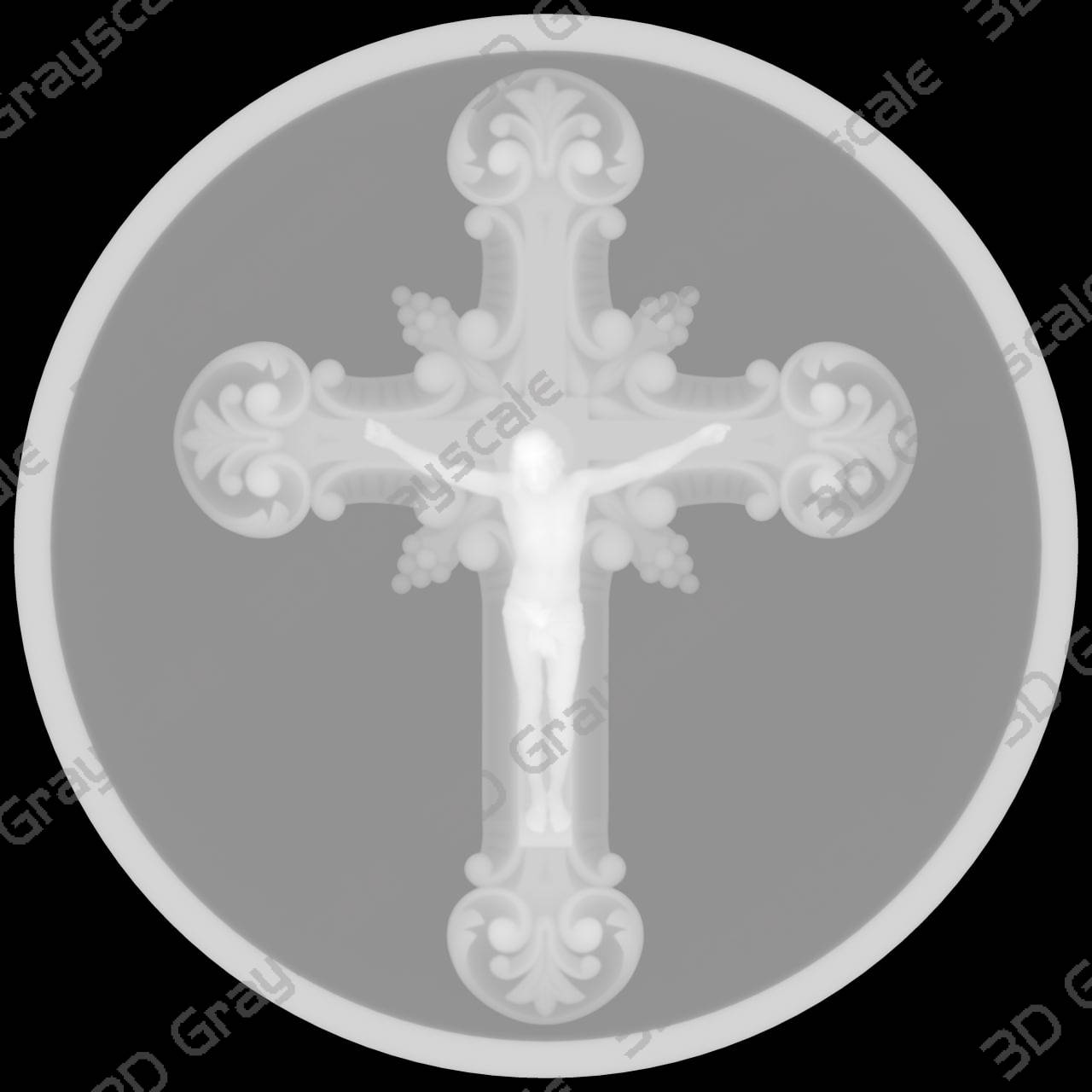 High-quality grayscale depth map of a crucifix coin relief. Designed for displacement, parallax mapping, 3D rendering, engraving, CNC, and VFX use.