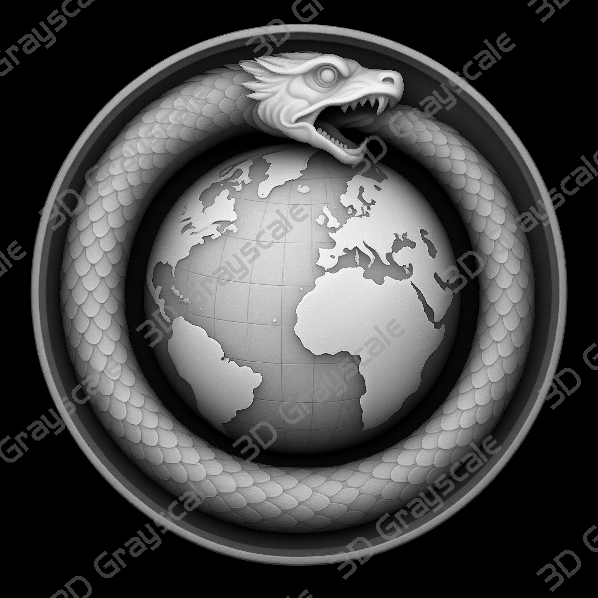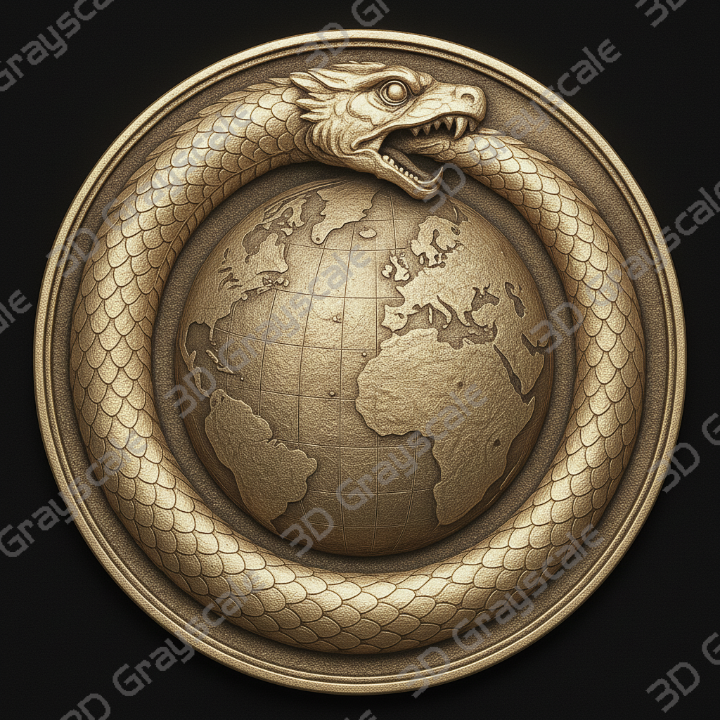 Highly detailed Jormungandr encircling world viking mythology coin depth map designed for 3D laser engraving, embossing, and relief engraving on coins.