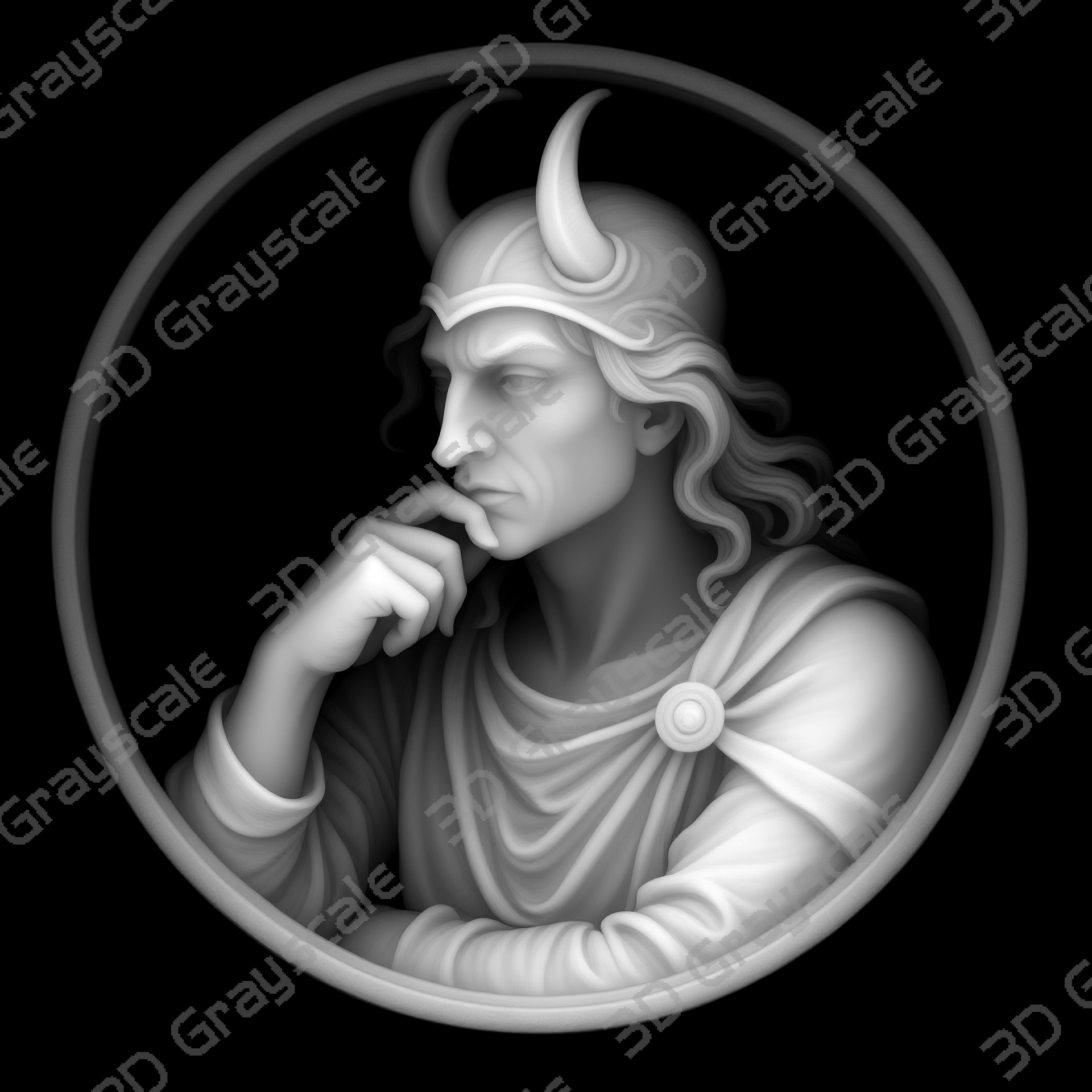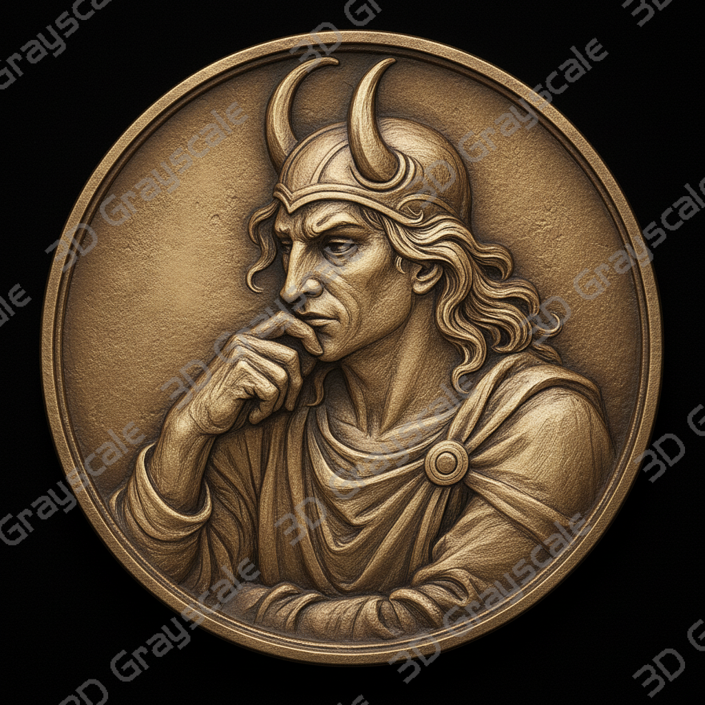 Highly detailed Loki the trickster viking mythology coin depth map designed for 3D laser engraving, embossing, and relief engraving on coins.