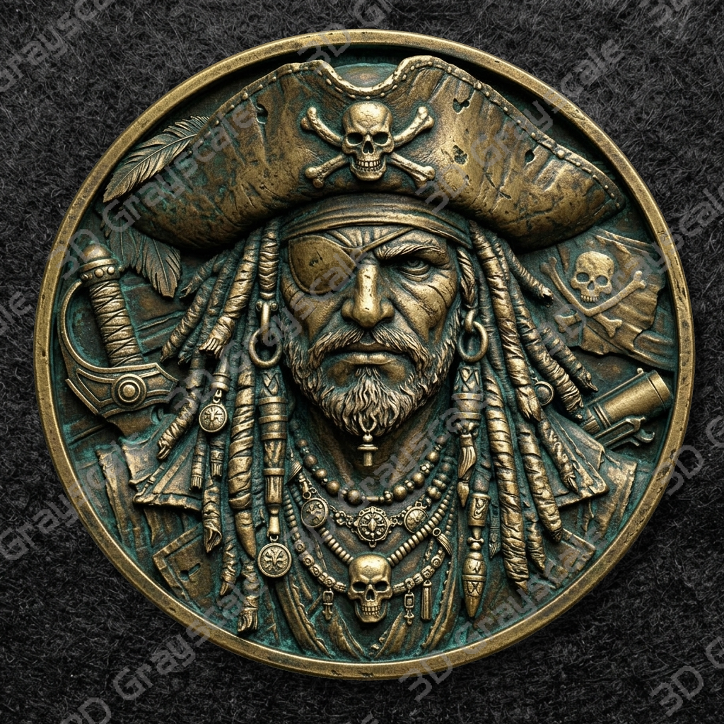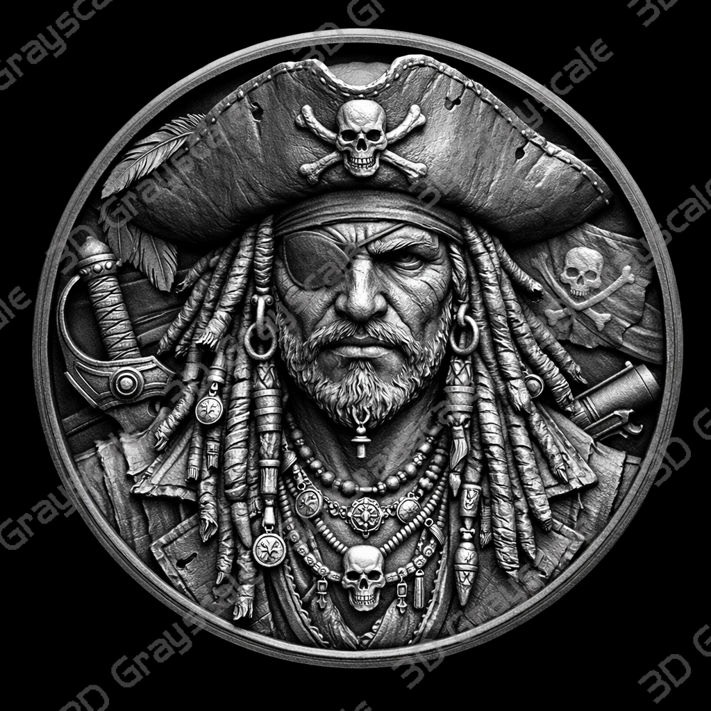 Highly detailed Pirate Captain coin depth map designed for 3D laser engraving, embossing, and relief engraving on coins.