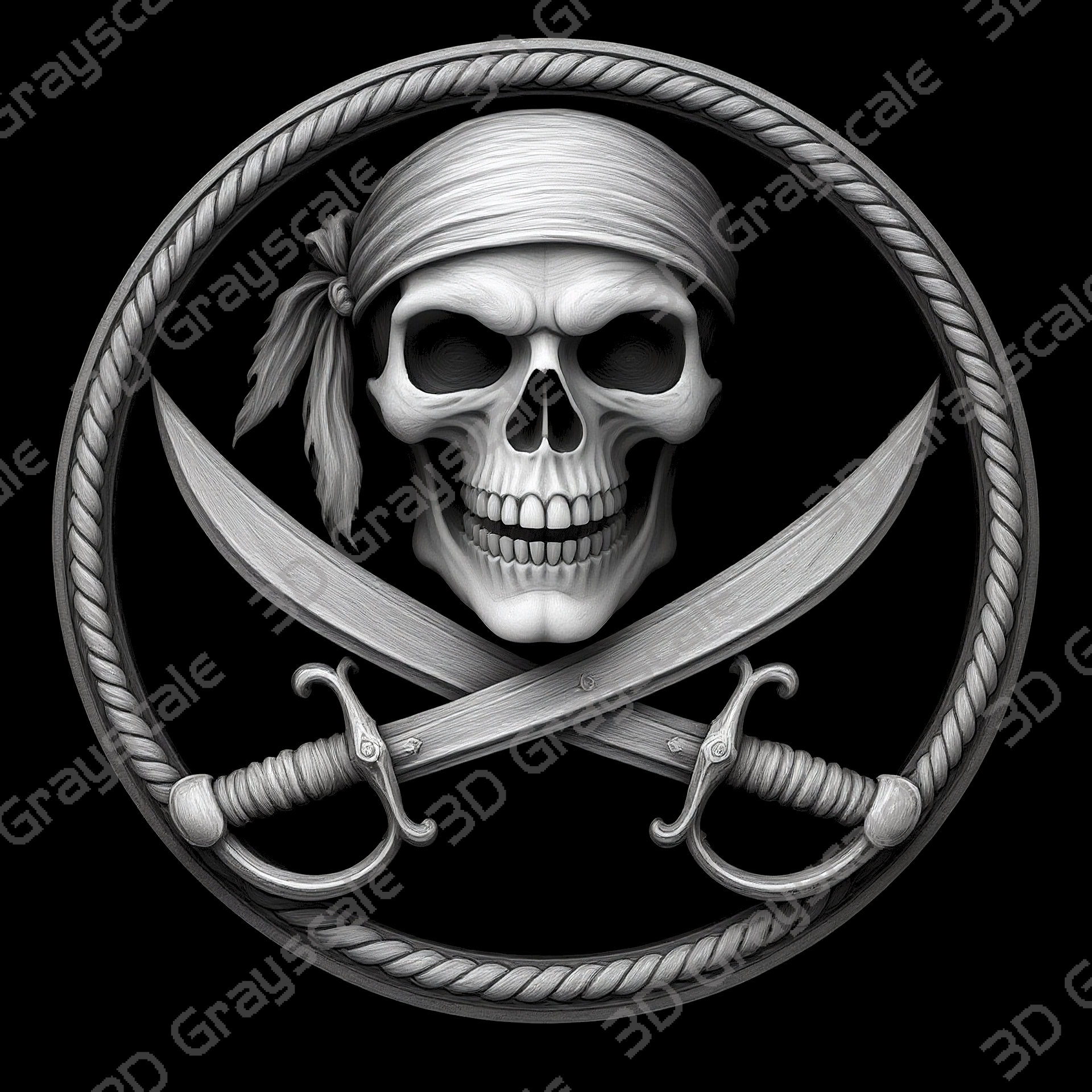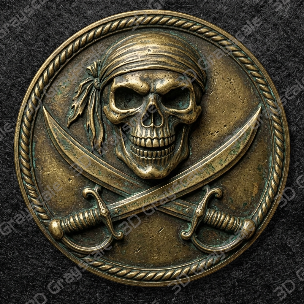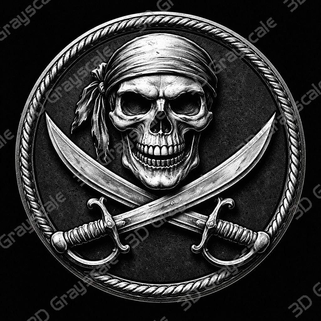 Highly detailed Pirate Skull & Crossed Cutlasses coin depth map designed for 3D laser engraving, embossing, and relief engraving on coins.
