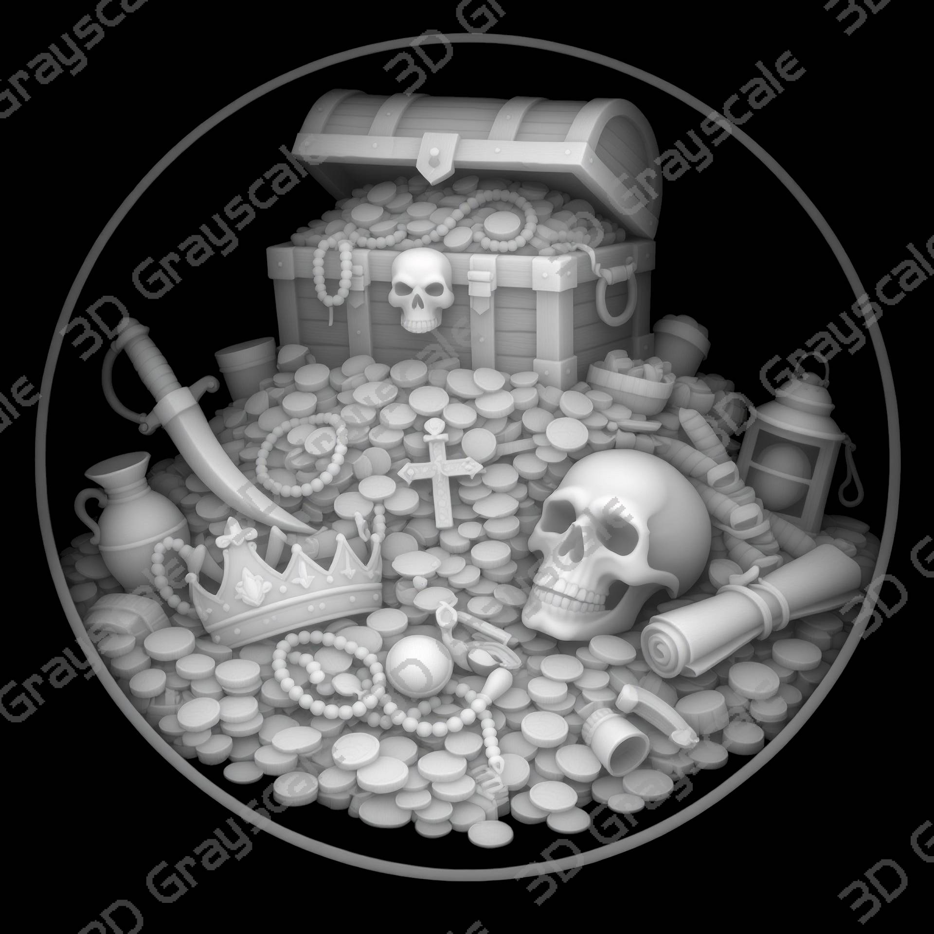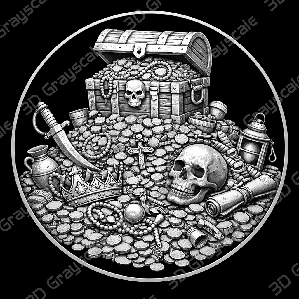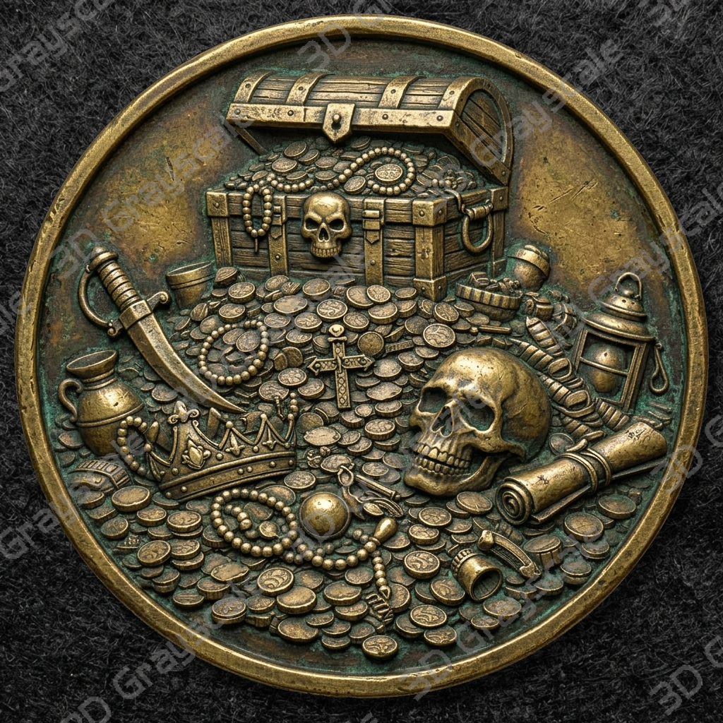 Highly detailed Pirate Treasure Chest coin depth map designed for 3D laser engraving, embossing, and relief engraving on coins.