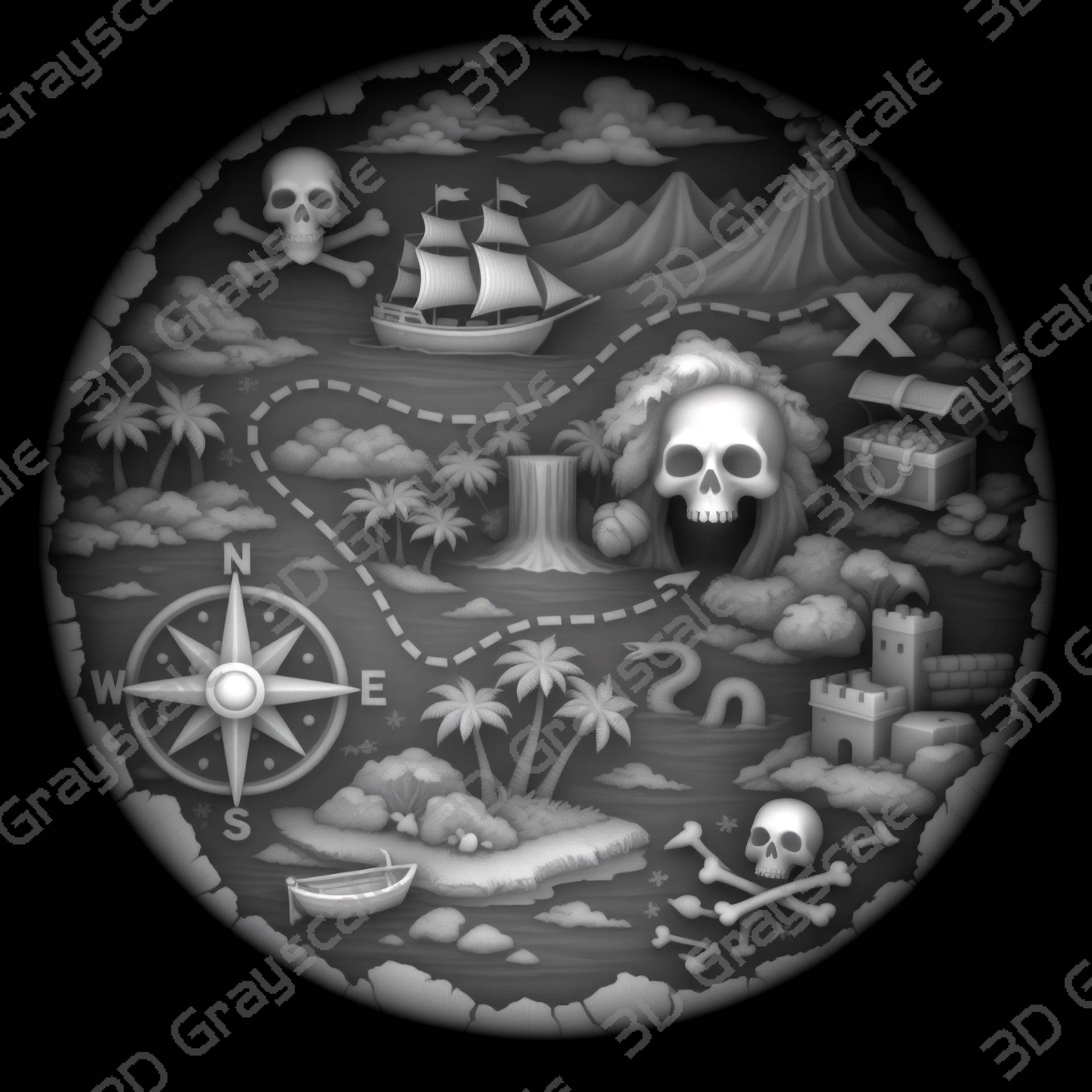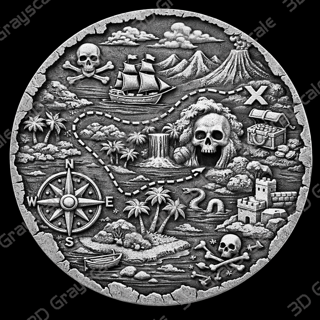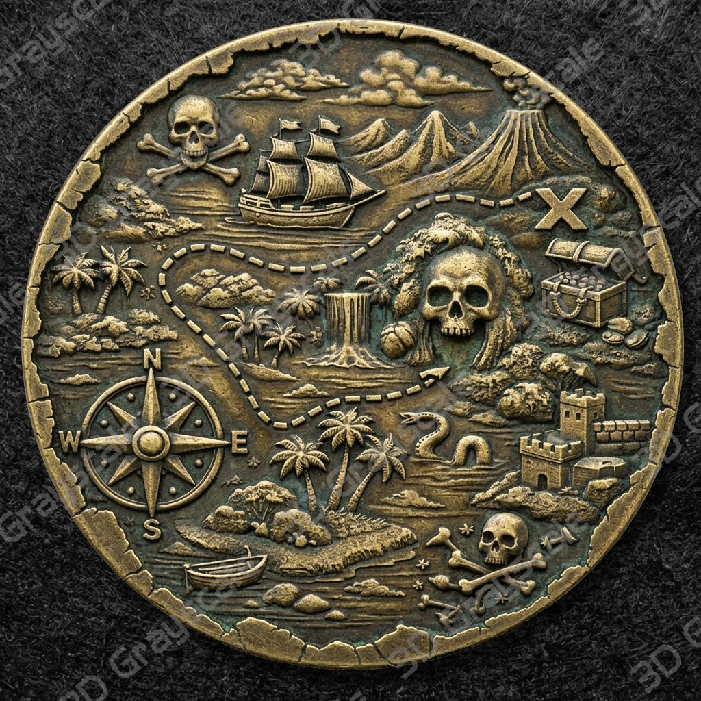 Highly detailed Pirate Treasure Map coin depth map designed for 3D laser engraving, embossing, and relief engraving on coins.