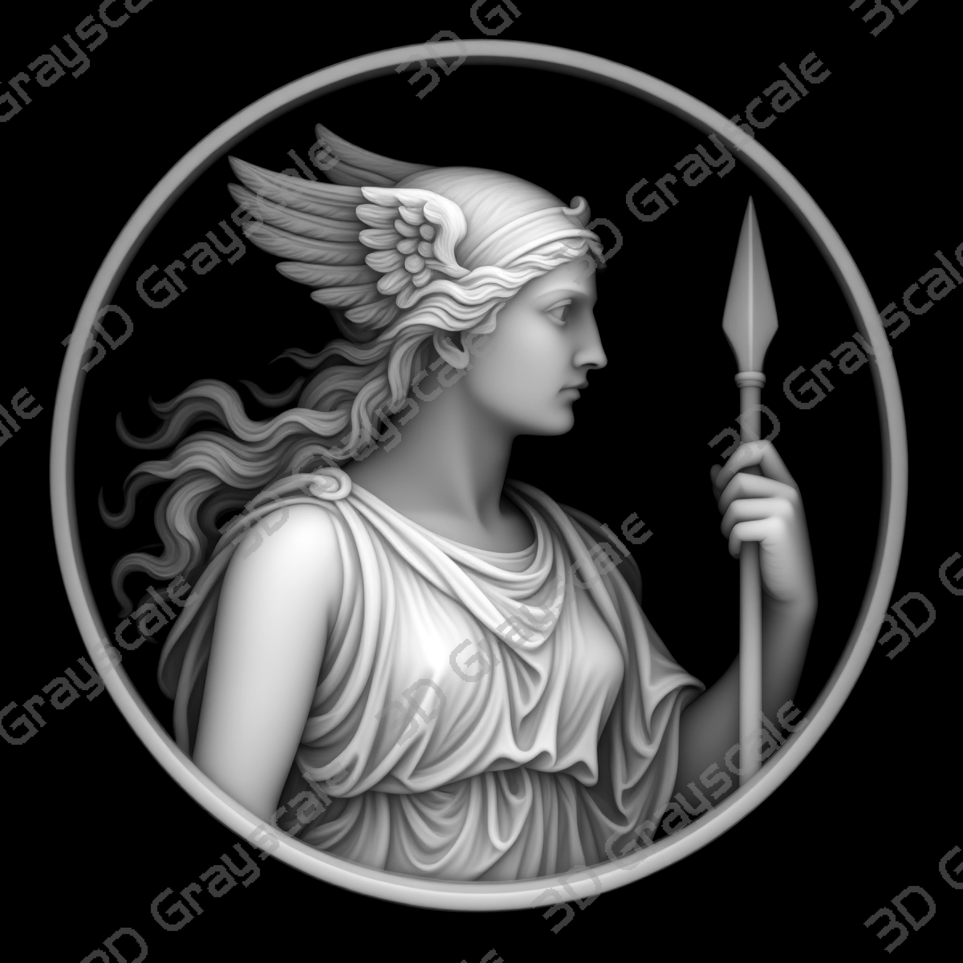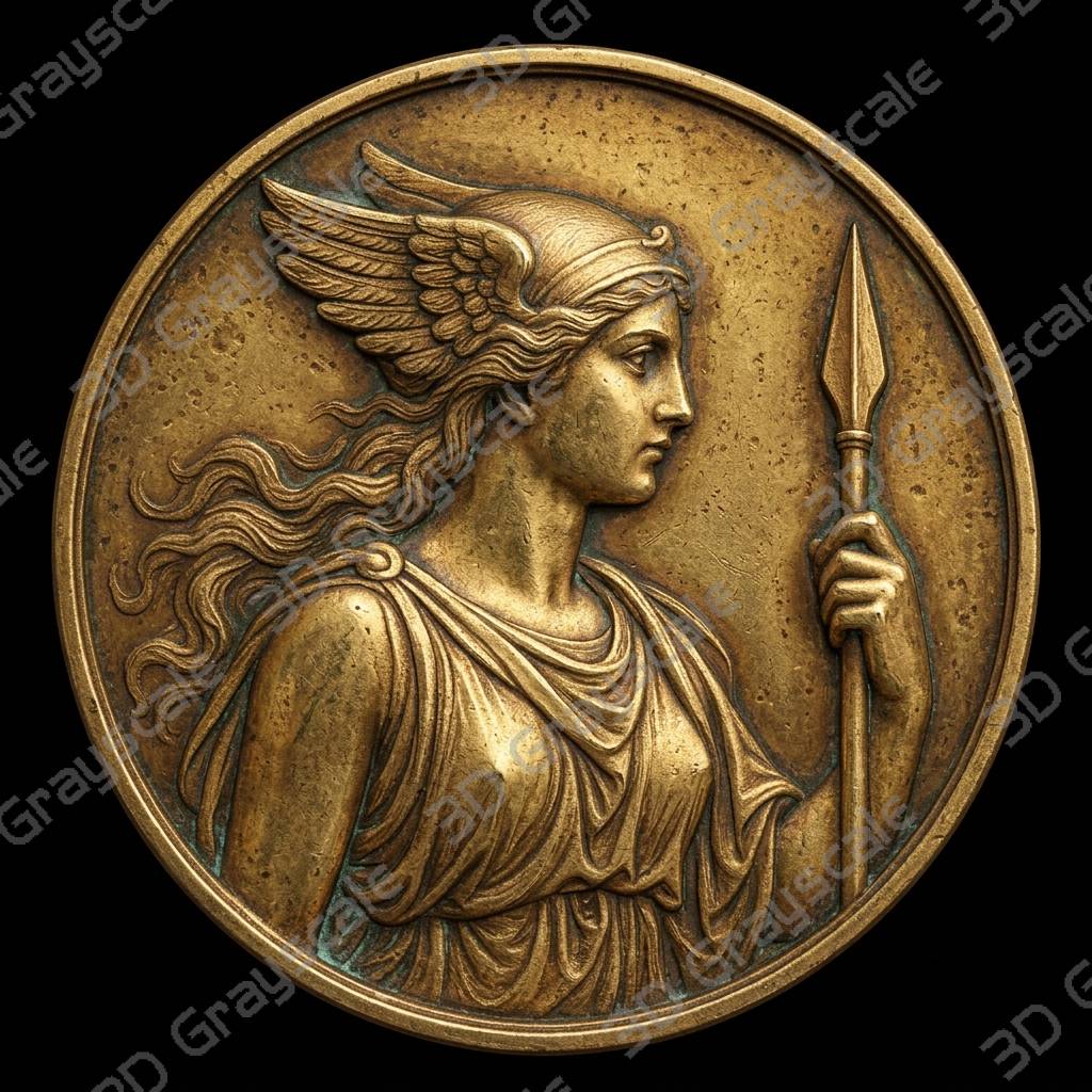 Highly detailed Valkyrie bearing spear viking mythology coin depth map designed for 3D laser engraving, embossing, and relief engraving on coins.