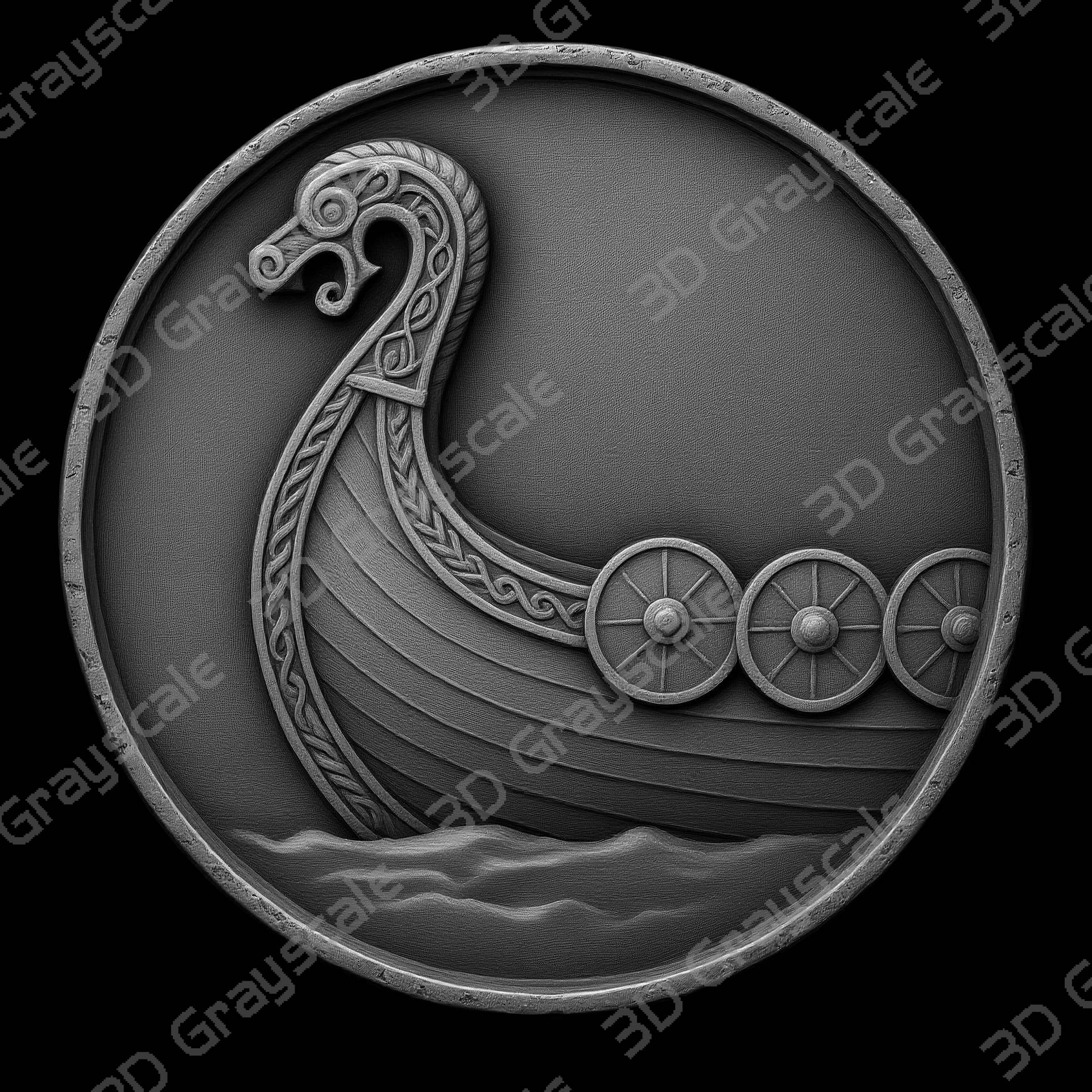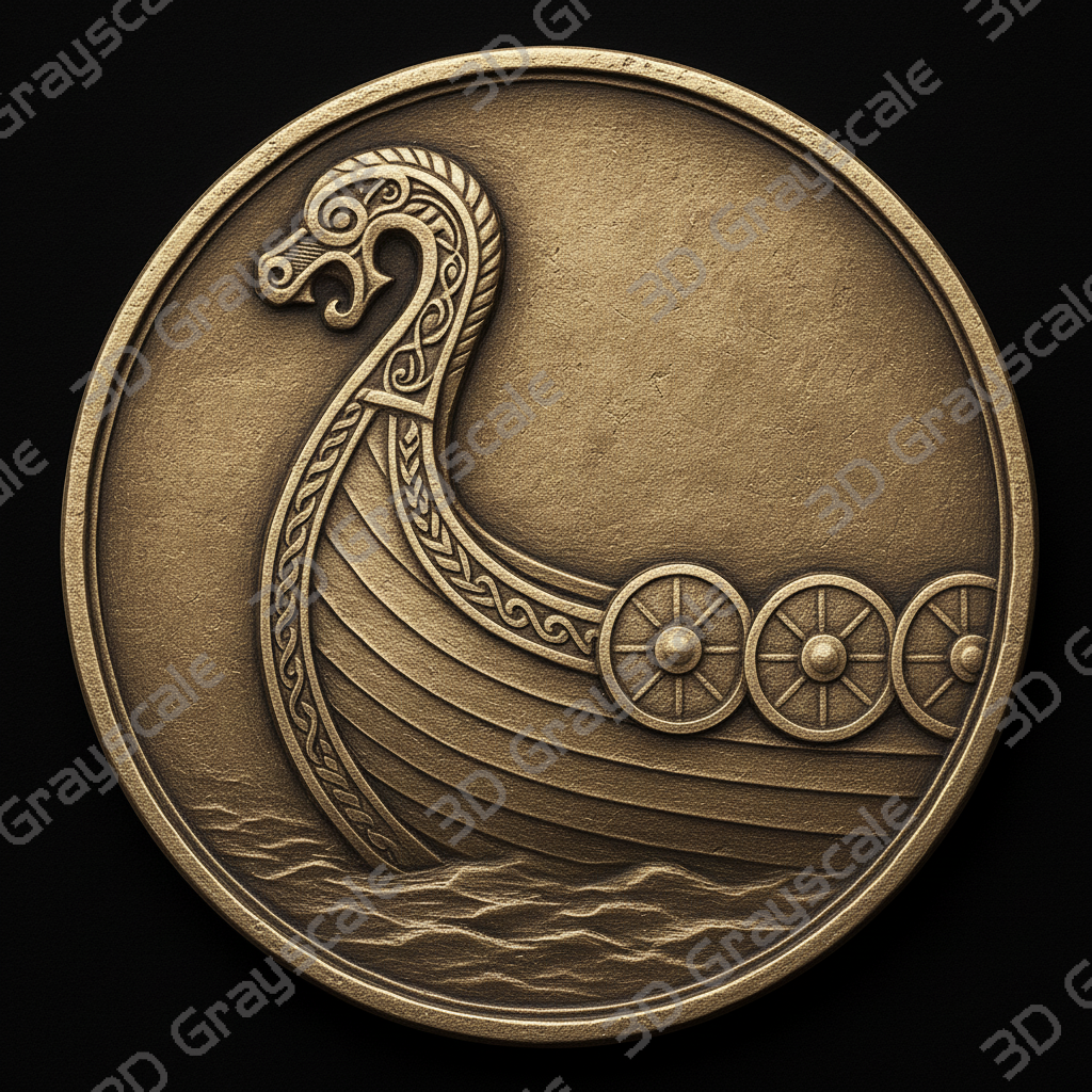 Highly detailed Viking longship prow viking mythology coin depth map designed for 3D laser engraving, embossing, and relief engraving on coins.